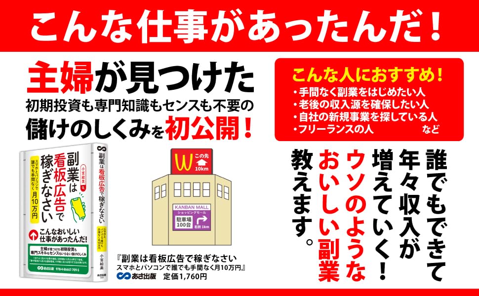 本書の中心は、広告主と看板媒体をつなぎ、掲出料の一部を受け取る仲介型の副業モデルです。自分で媒体を保有せずに始められるため、初期費用を抑えやすいのが特徴です。