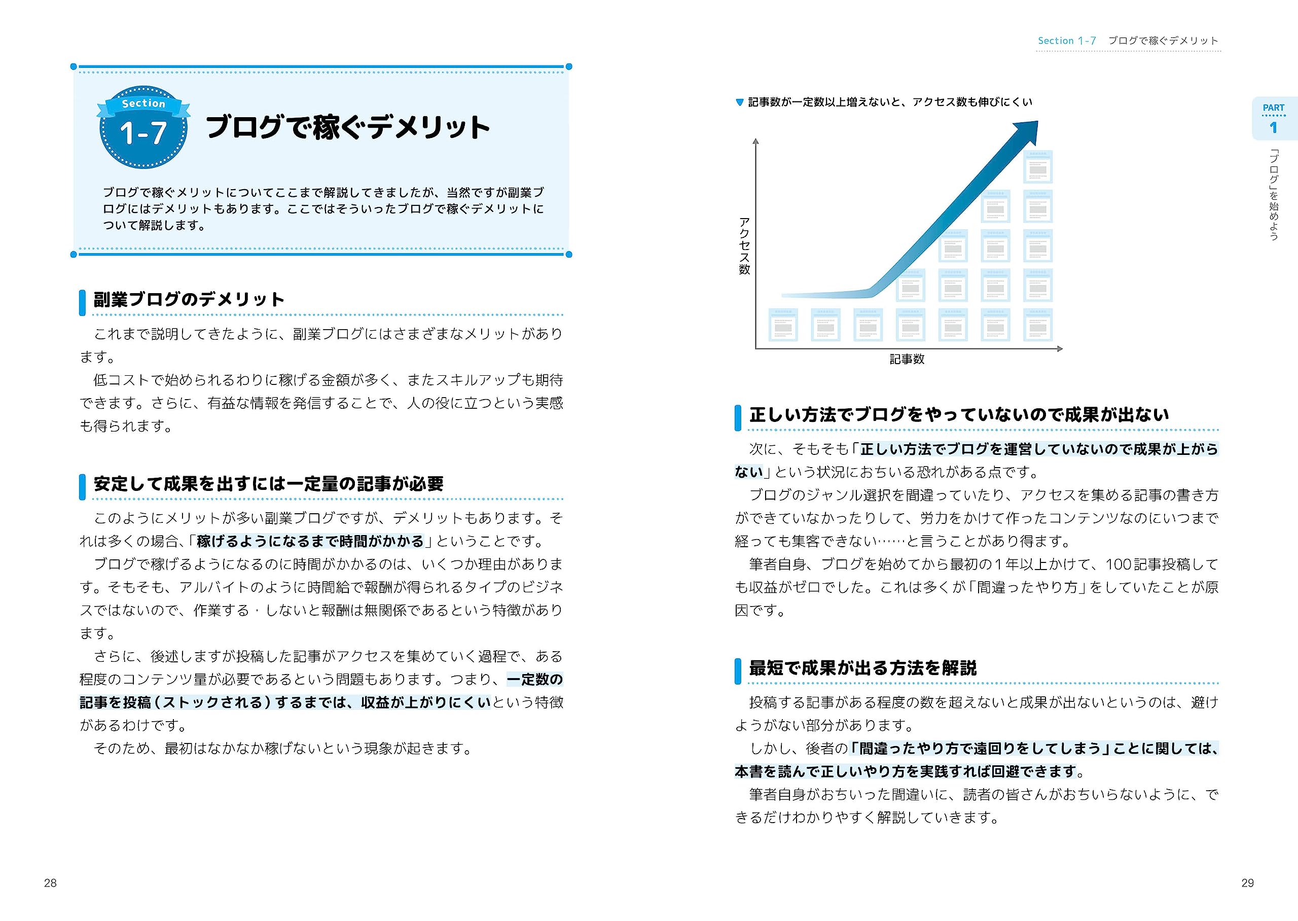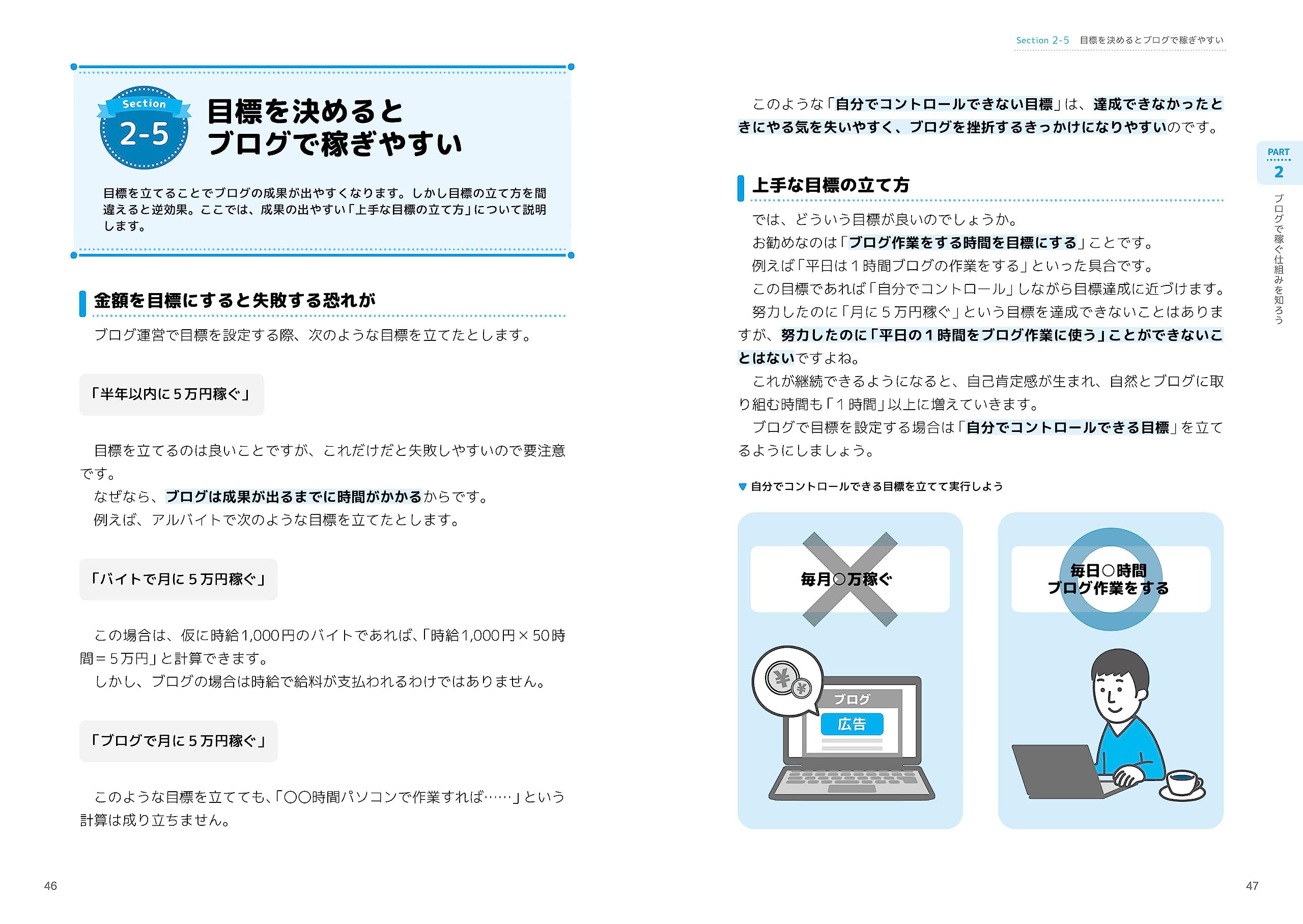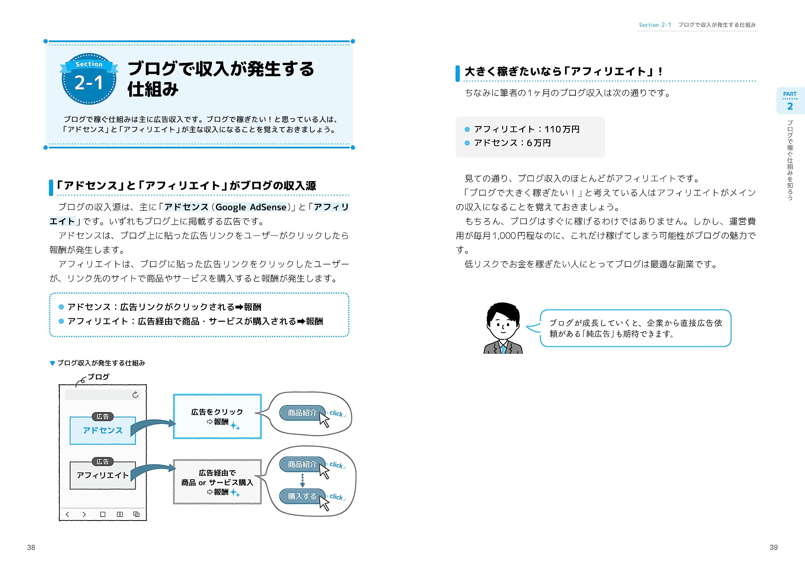 ブログの立ち上げ、初期設定、ジャンル選定、記事の基本構成までが段階的に説明されています。「次に何をすればいいか」が常に見えるので、手を動かしながら読み進められます。