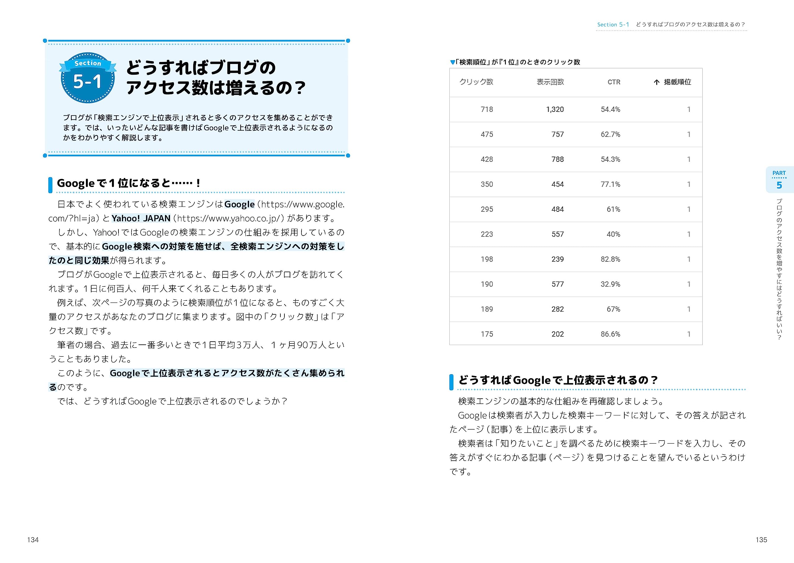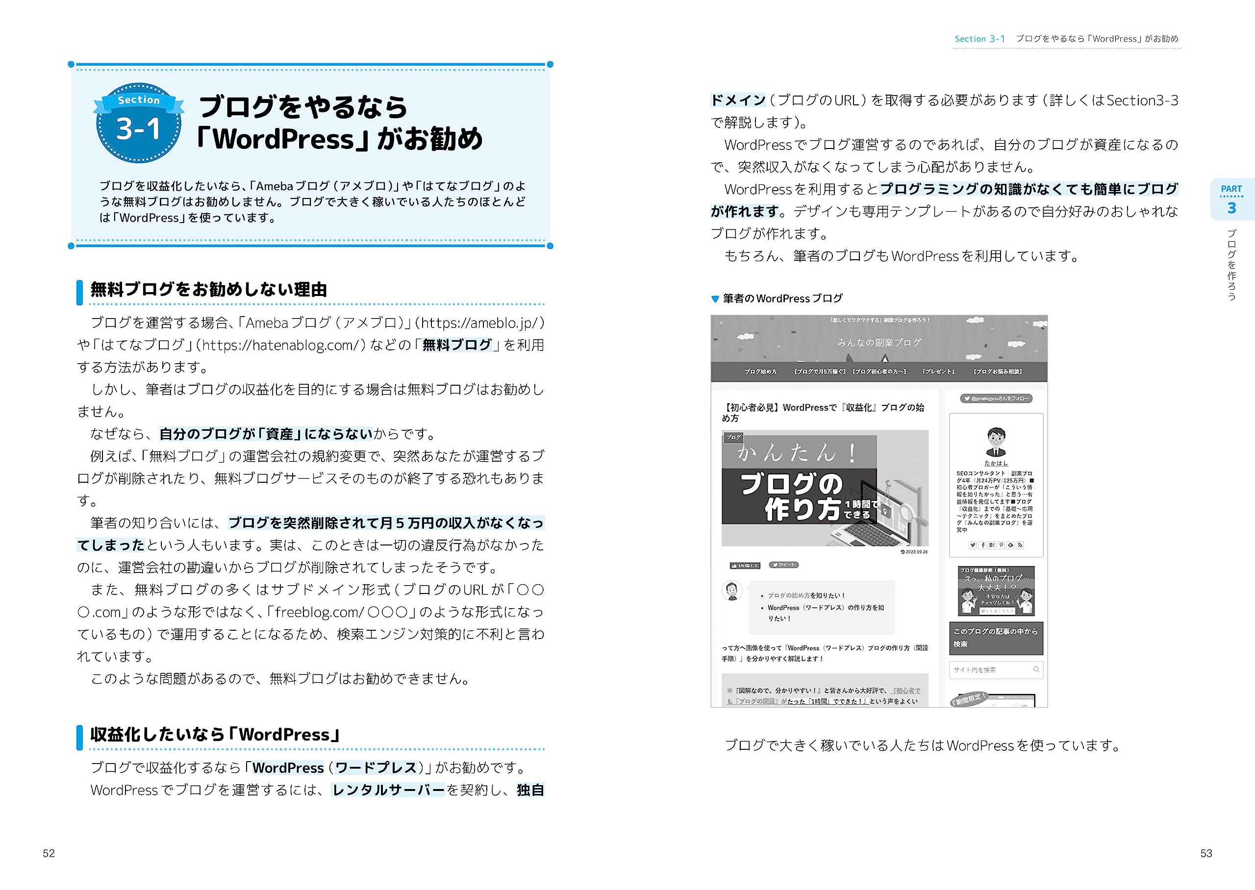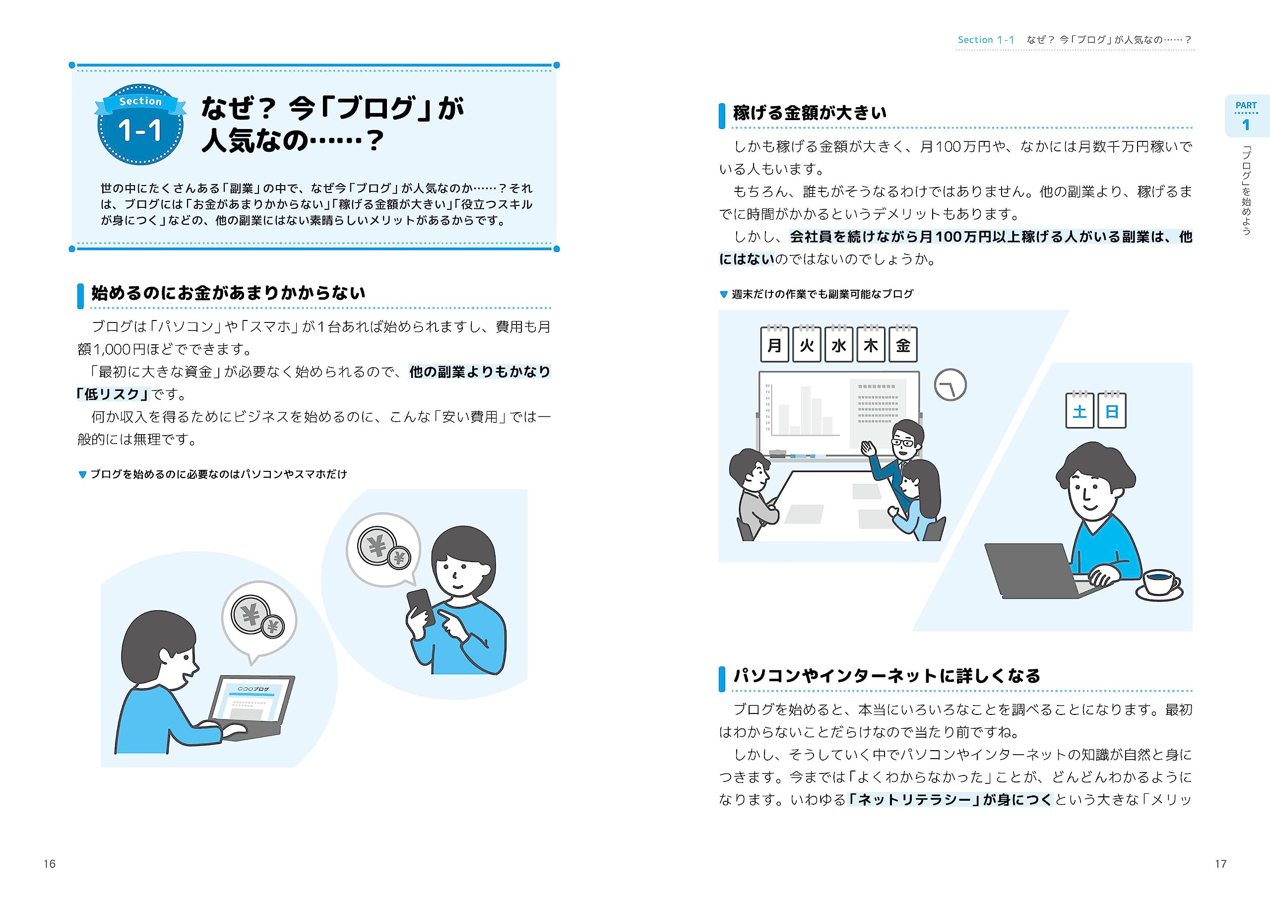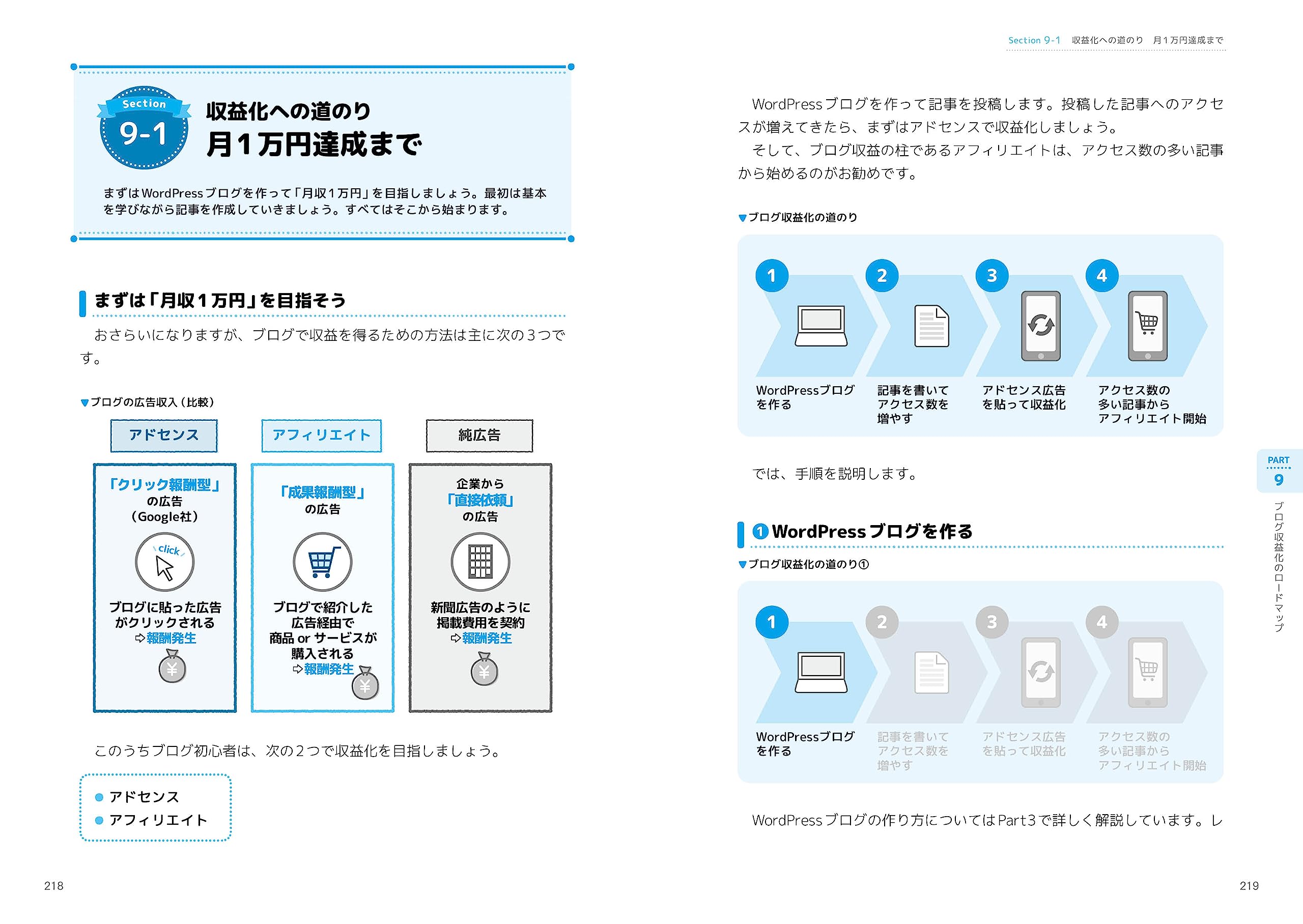 ブログの立ち上げ、初期設定、ジャンル選定、記事の基本構成までが段階的に説明されています。「次に何をすればいいか」が常に見えるので、手を動かしながら読み進められます。