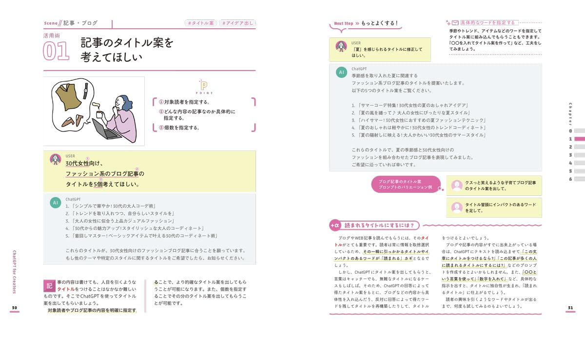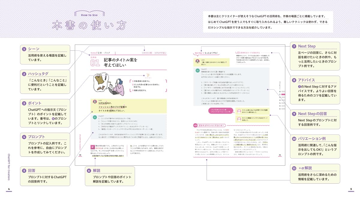 ブログの見出し案、SNS投稿文、キャッチコピーなど、言葉を扱う場面での使い方が豊富に紹介されています。白紙を埋める初速アップに直結する例が多く、発信系の仕事をしている読者にとくに刺さります。