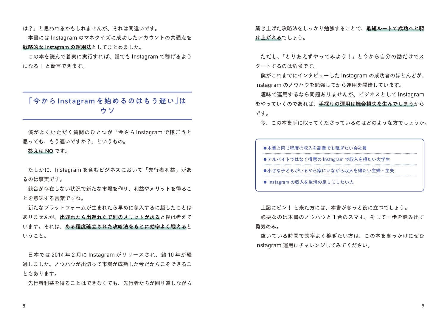 SNS運用の本として読むと、最初から「売る前提」で設計されているのが良かったです。フォロワー数の見栄ではなく、誰に何を届けるかから逆算する思考法が一貫しています。特にプロフィールと導線設計の話はBtoC運用でもそのまま使える実用性がありました。派手な裏技やバズらせテクニック集ではないですが、運用がぶれやすい人にはこの堅実さがむしろ効きます。副業目的でInstagramを始めるなら、最初の一冊としてかなり強いと思いました。