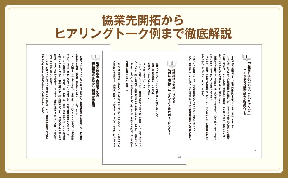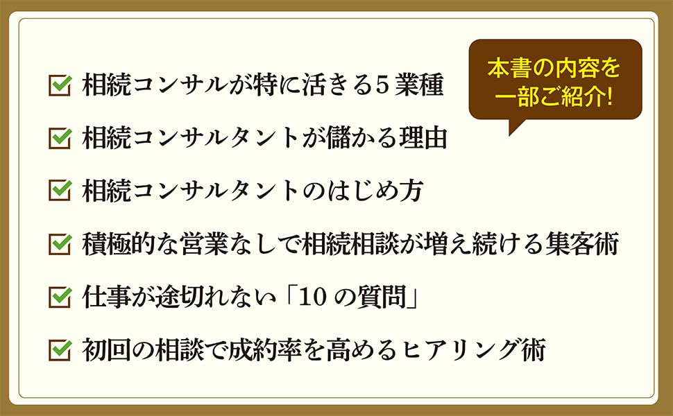 保険、不動産、建築、FPなど、すでに顧客接点がある仕事ほど相続との相性が良いと説いています。新しい商品を無理に売り込むのではなく、既存顧客の悩みを深く拾うことで相談料・紹介料・本業の受注機会につなげる考え方が中心です。