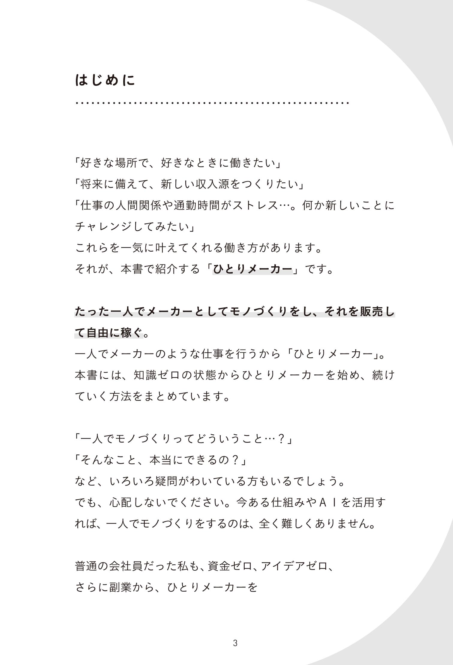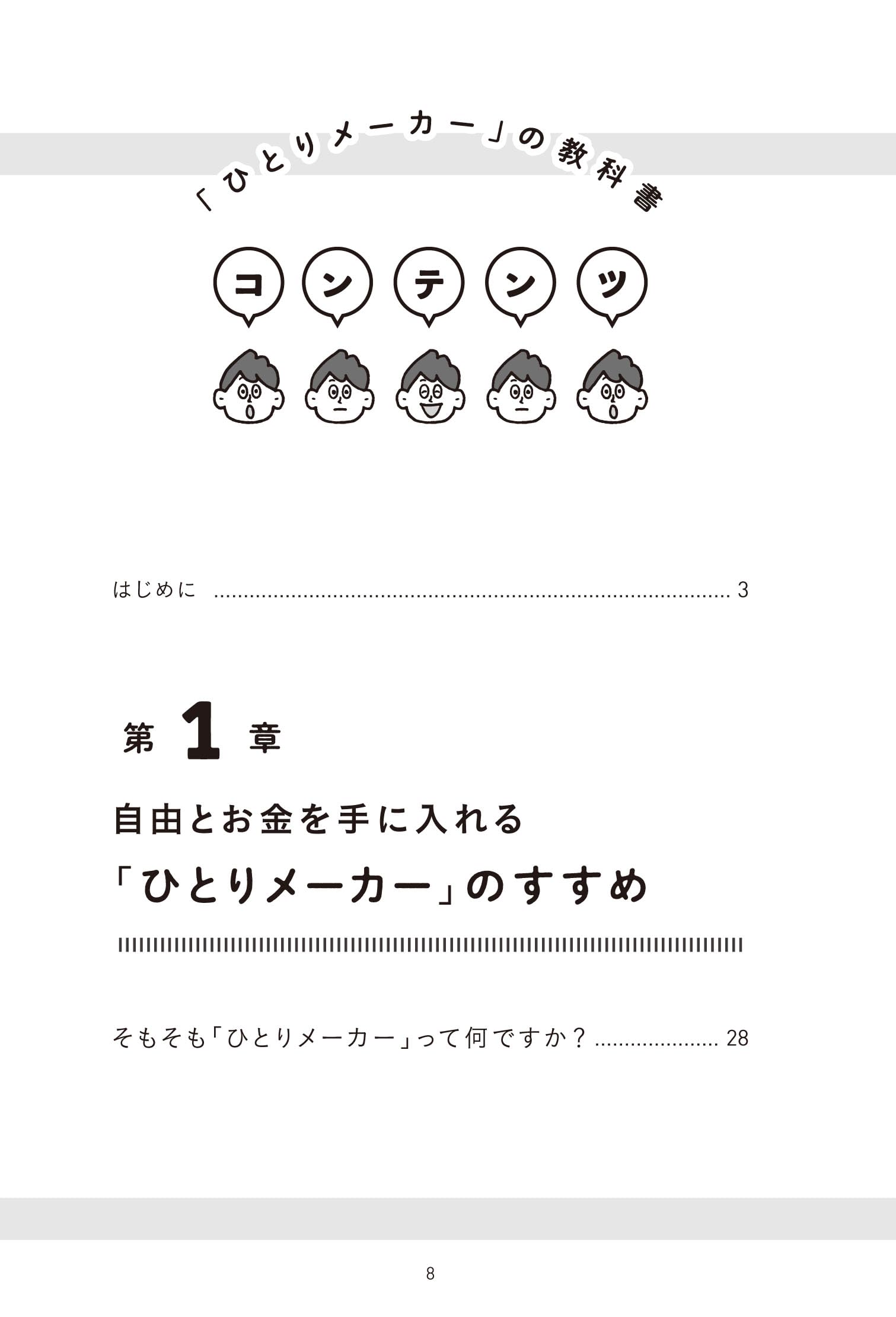 - 1{"chapter":"第1章","title":"自由とお金を手に入れる「ひとりメーカー」のすすめ","description":"なぜモノを売るビジネスが初心者に向いているのか、ひとりメーカーの全体像と著者自身の独立経緯を解説する"}