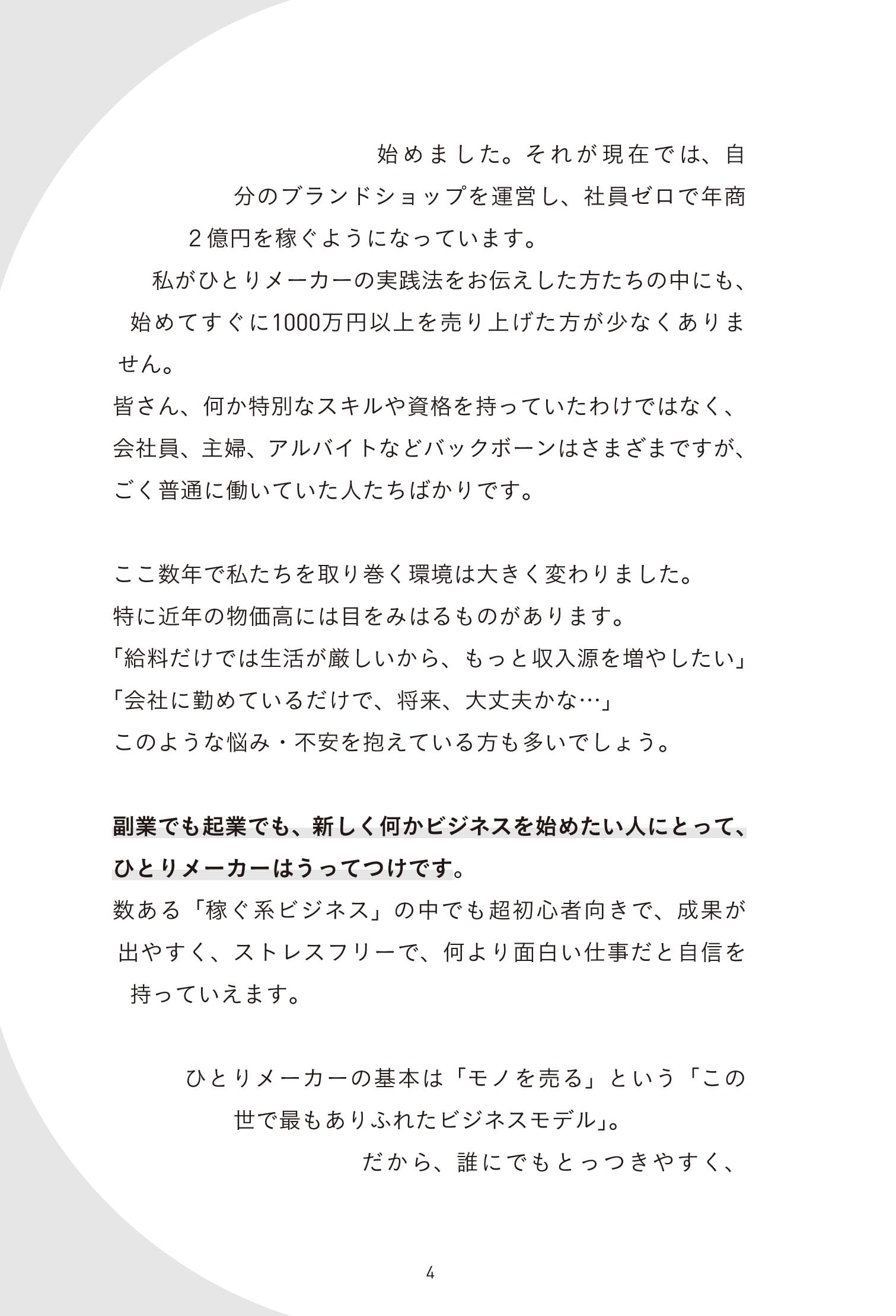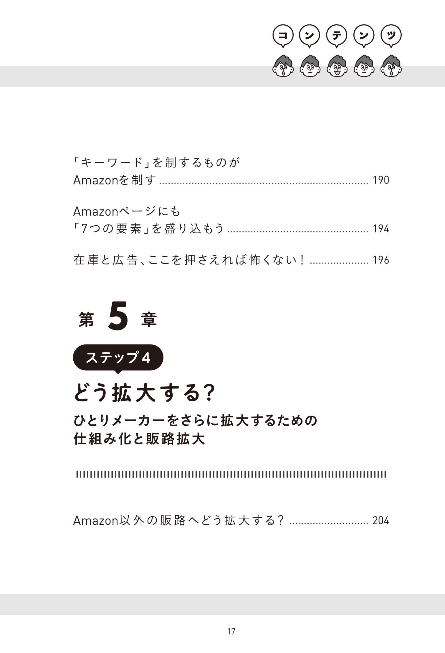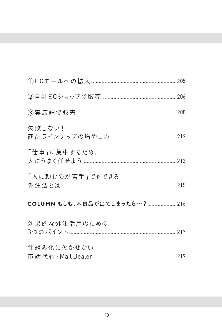 - 5{"chapter":"第5章","title":"ステップ4 どう拡大する?","description":"広告運用、メディア露出、外注化による仕組み化、販路拡大でひとりメーカーをスケールさせる方法を紹介する"}