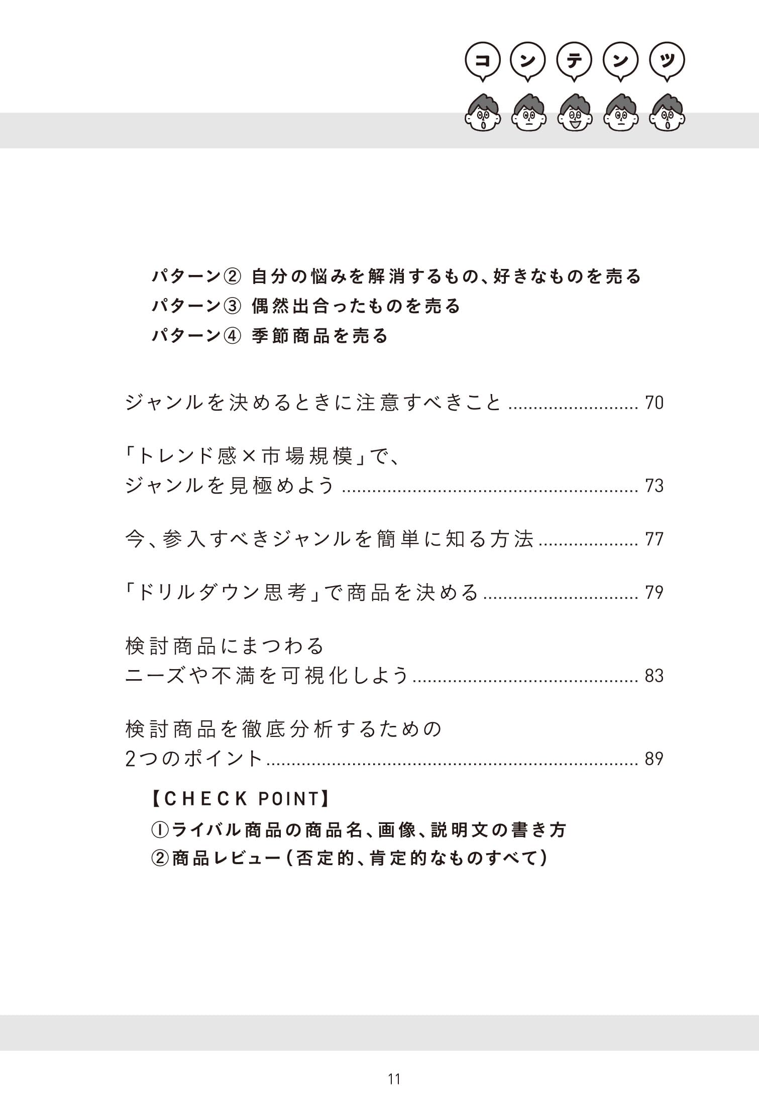 - 2{"chapter":"第2章","title":"ステップ1「何を売るか」を決める","description":"売れている商品の調査方法、改良ポイントの見つけ方、ニーズ検証のアプローチを具体的に紹介する"}