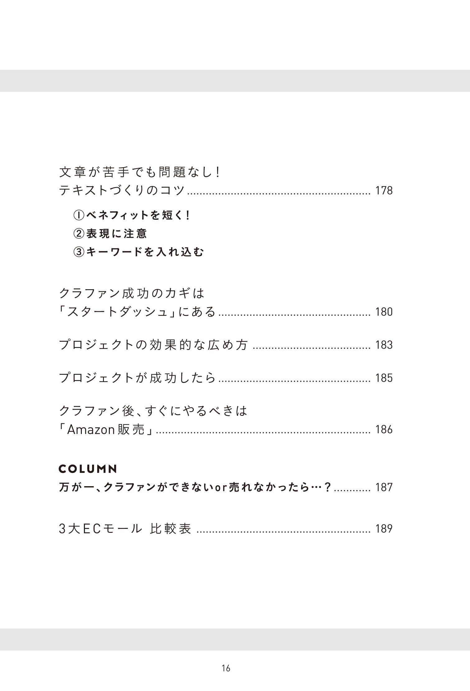 - 4{"chapter":"第4章","title":"ステップ3 どこで売るか","description":"Amazonデビュー、クラウドファンディング、自社サイト構築など販売チャネルの選択と活用法を説明する"}