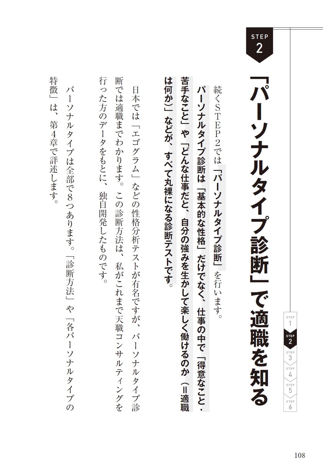 後半の6STEPでは、いきなり退職届を出すのではなく副業や小さな試行を挟みながら適性を検証する道筋が示されます。理想を描いて終わるのではなく、次の一手を具体的な行動計画に落とし込める実践的な構成です。