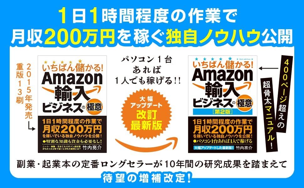 | 決定版 一生使えるAmazon輸入ビジネス大全 | 竹内亮介 | 初心者 | ★★★★★ 5.0 | ¥2,420 |