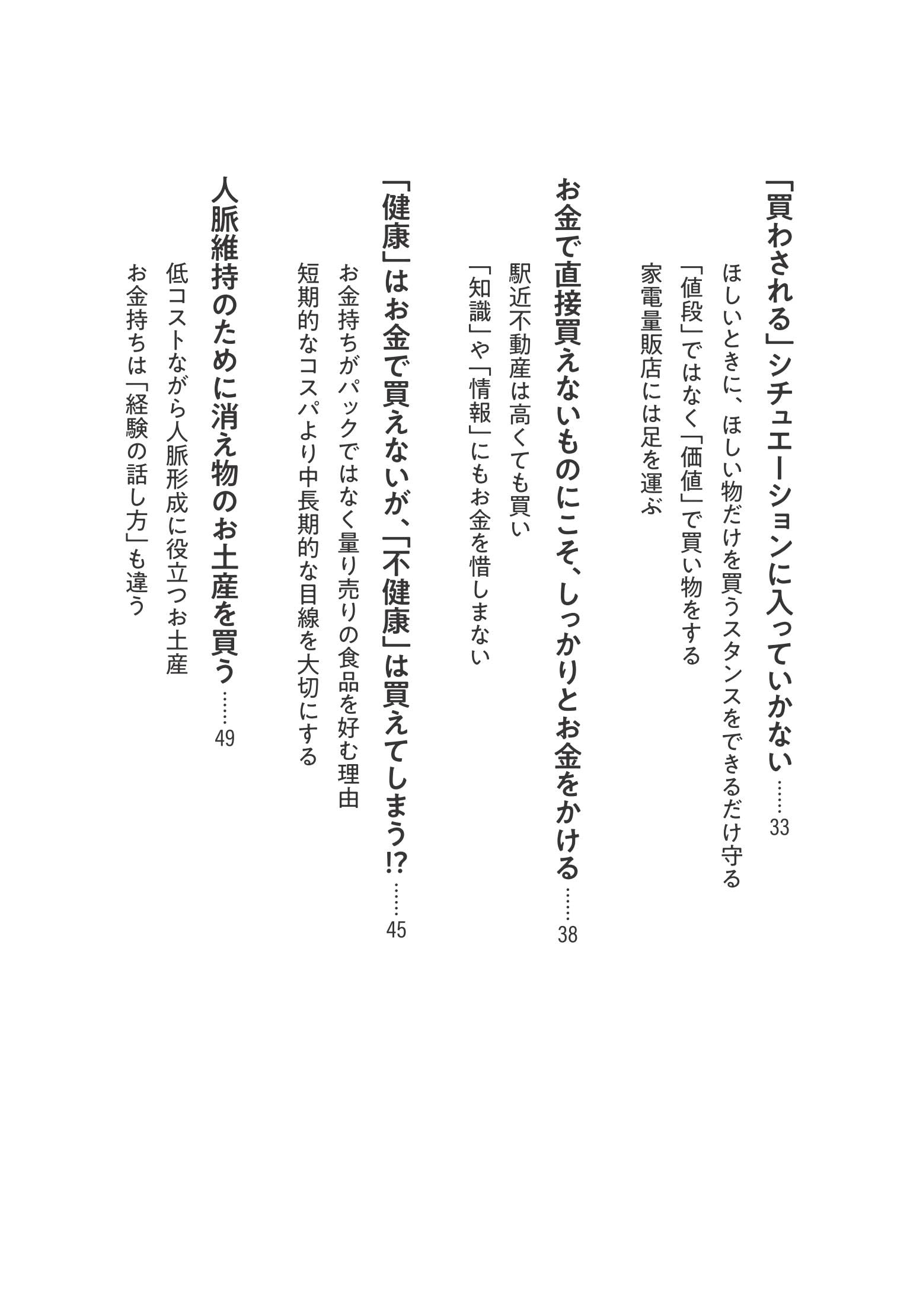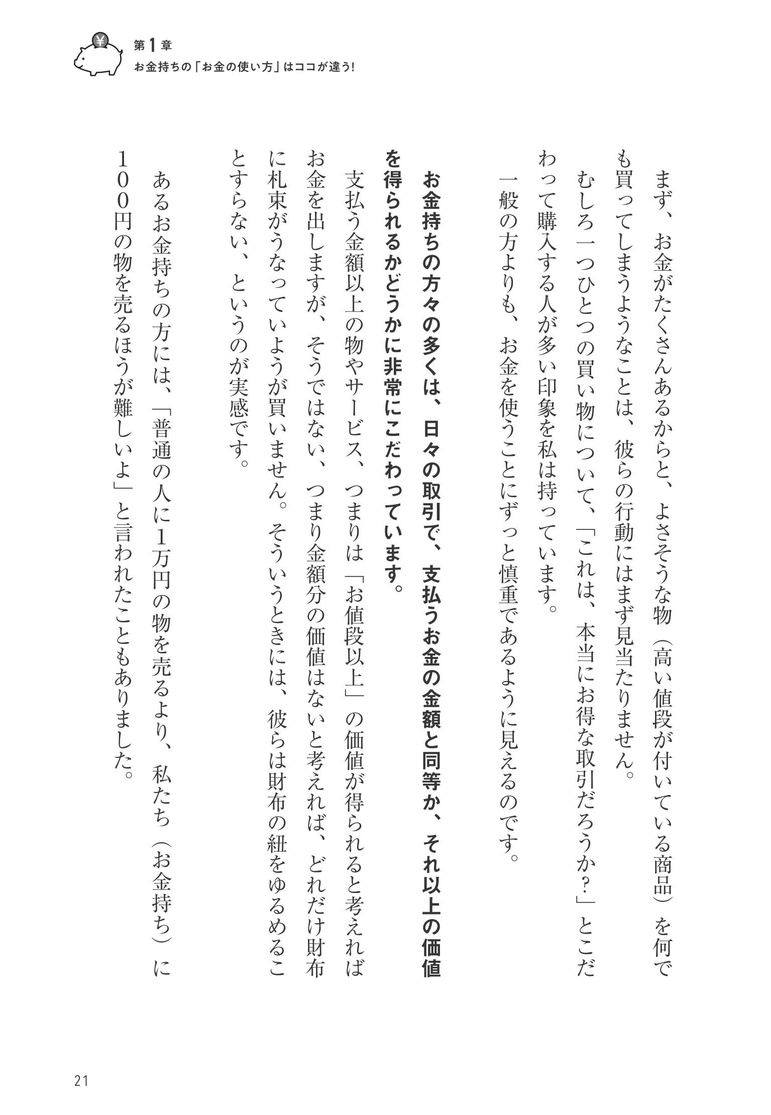 - 4{"chapter":"第4章","title":"お金持ちの「時間の使い方」は合理的","description":"時間をお金で買う感覚、自己投資と浪費の見極め方"}