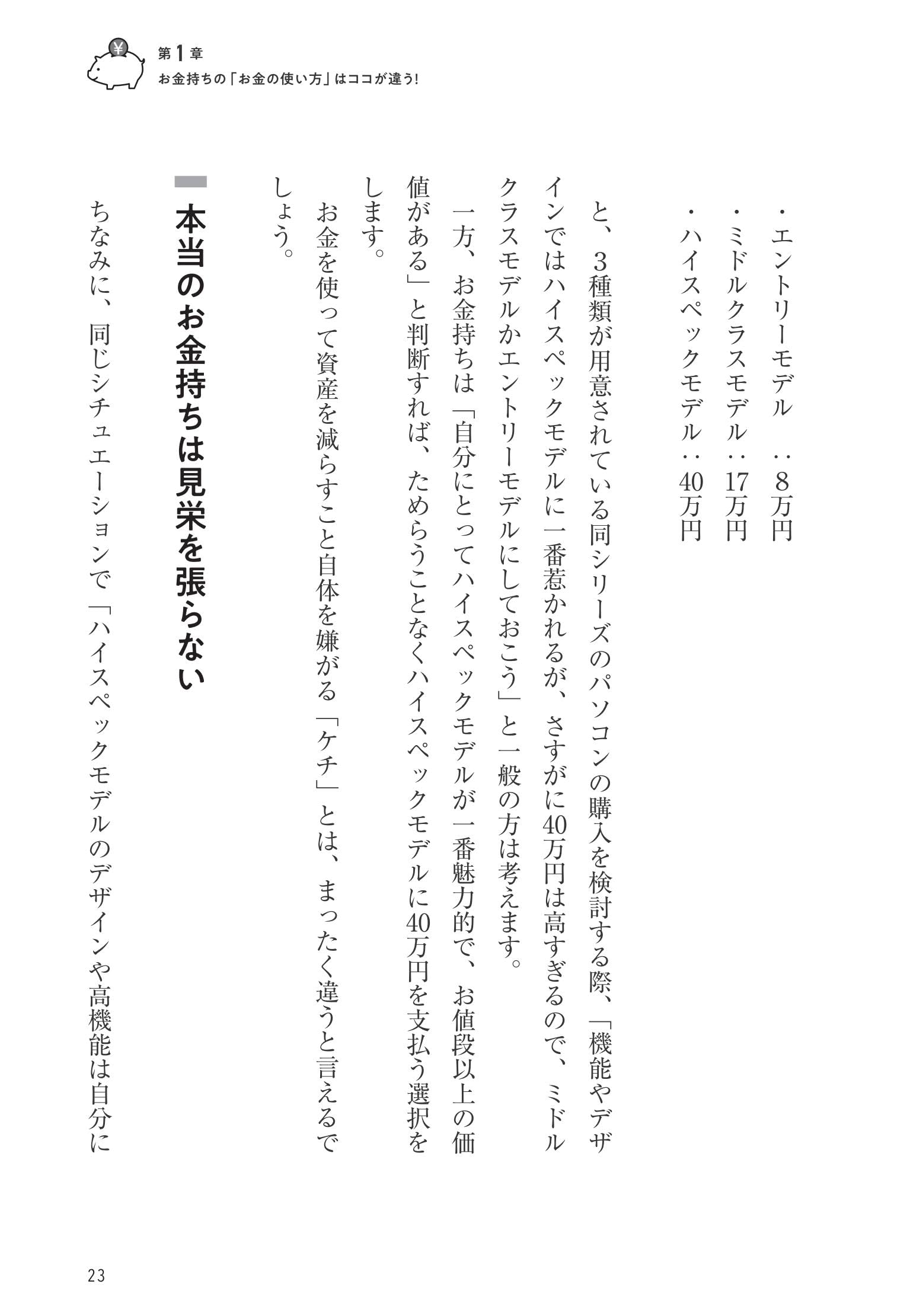 - 1{"chapter":"第1章","title":"お金持ちの「使い方」は合理的","description":"富裕層が日常の支出でどのような判断基準を持っているか、見栄と合理性の違いを解説"}