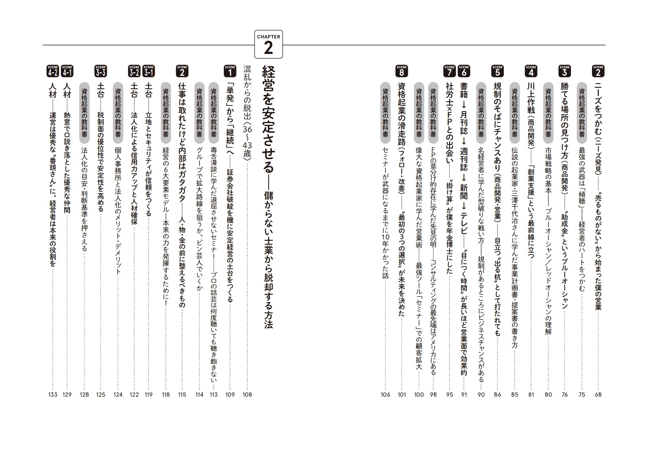 - 3{"chapter":"第3章","title":"事業を安定させる","description":"顧問契約の積み上げや業務の標準化など、安定収入を確保するための仕組みづくり。"}