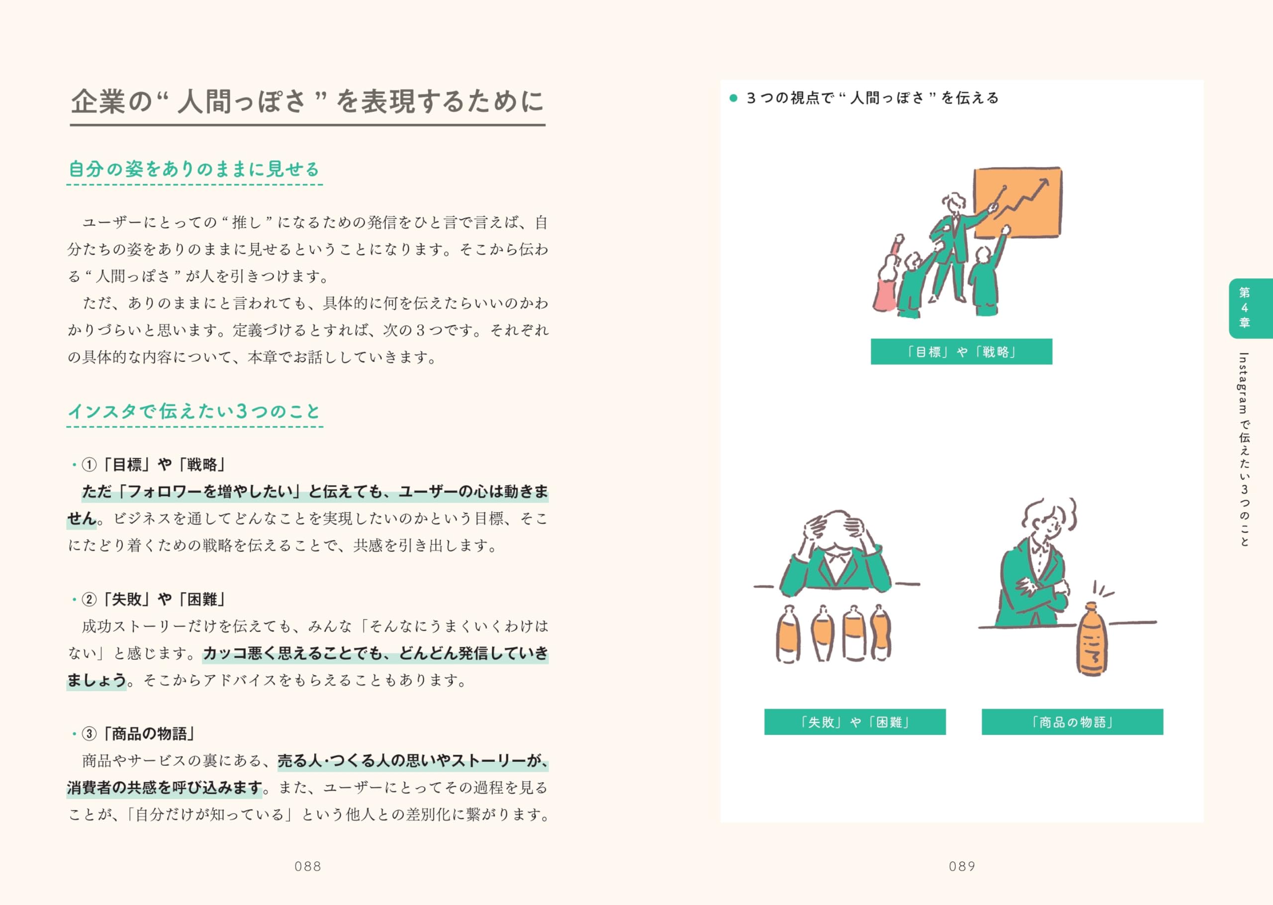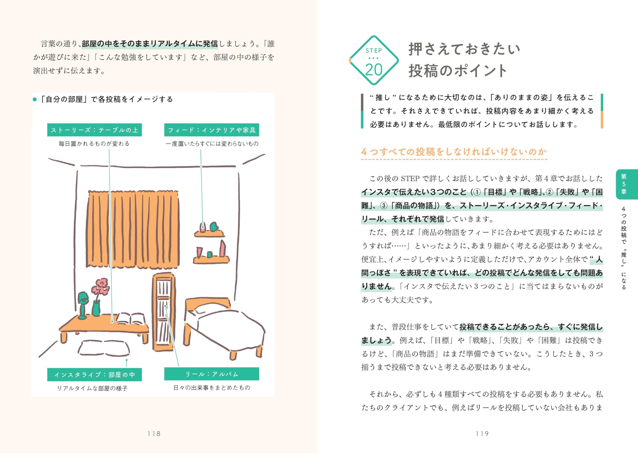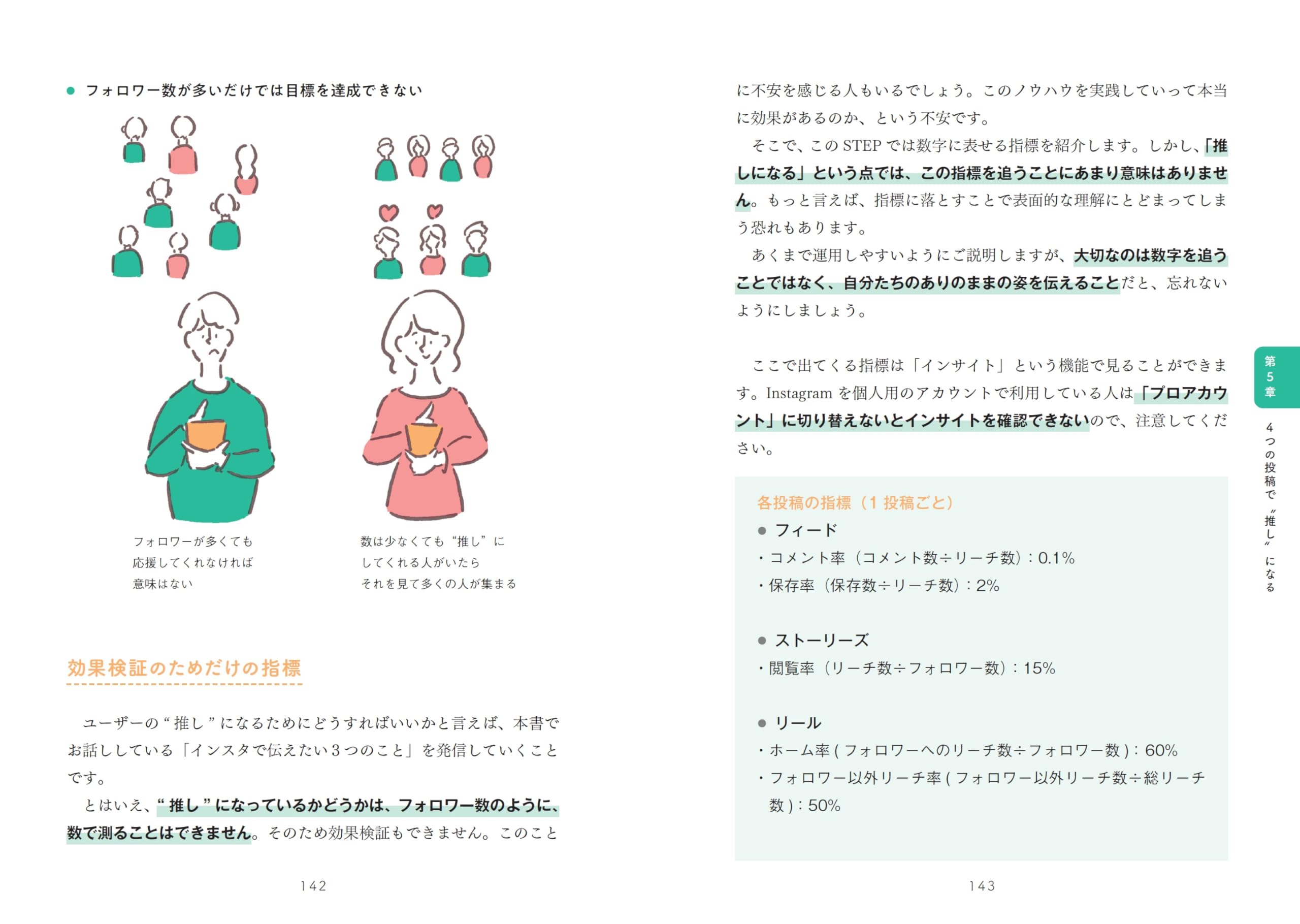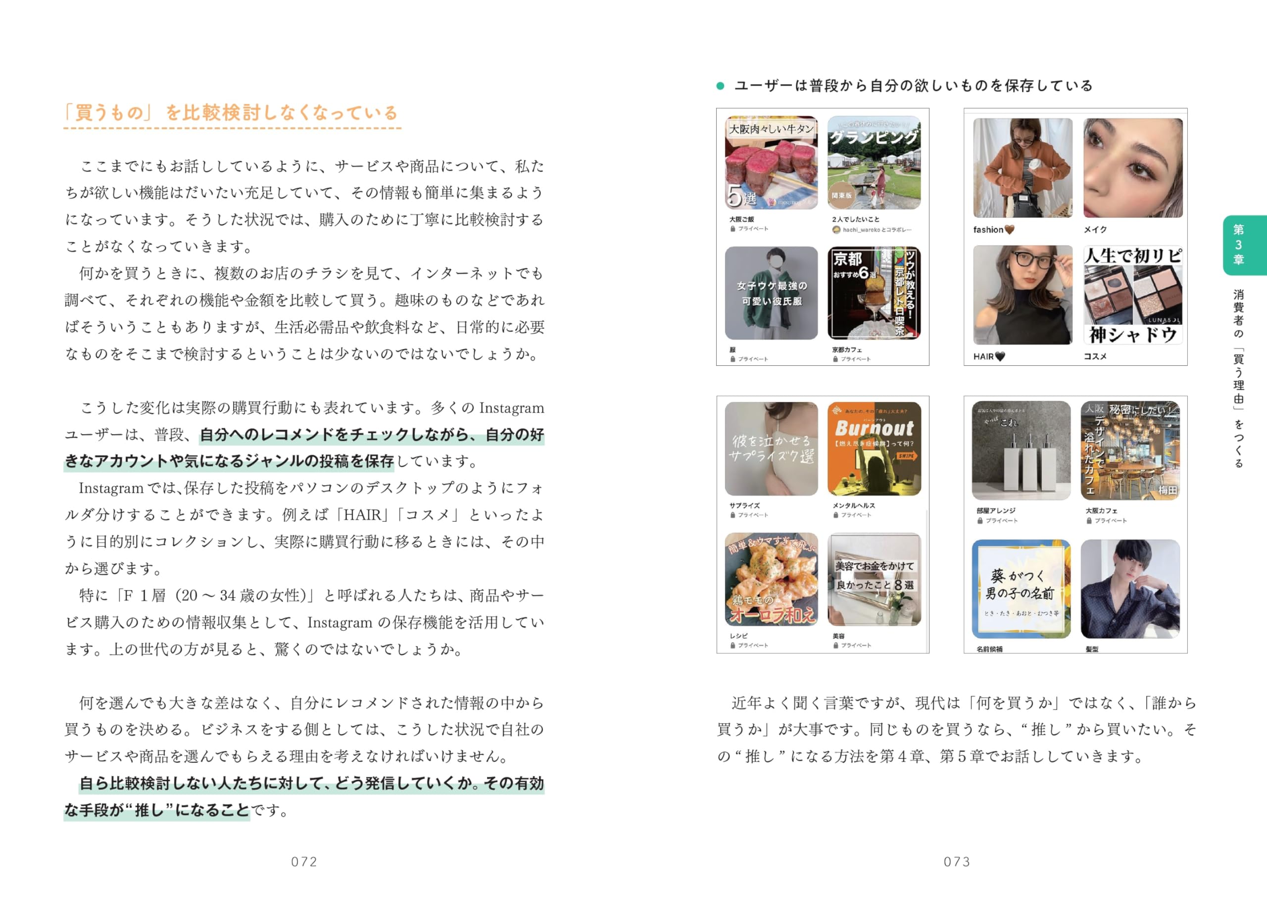 なぜ人はモノを買うのか、なぜ「推し」の商品を選ぶのかという消費者心理の分析を出発点に、それをInstagramの各機能に落とし込む構成になっている。小手先のテクニックではなく、購買行動の理解に根ざしたアプローチが特徴だ。