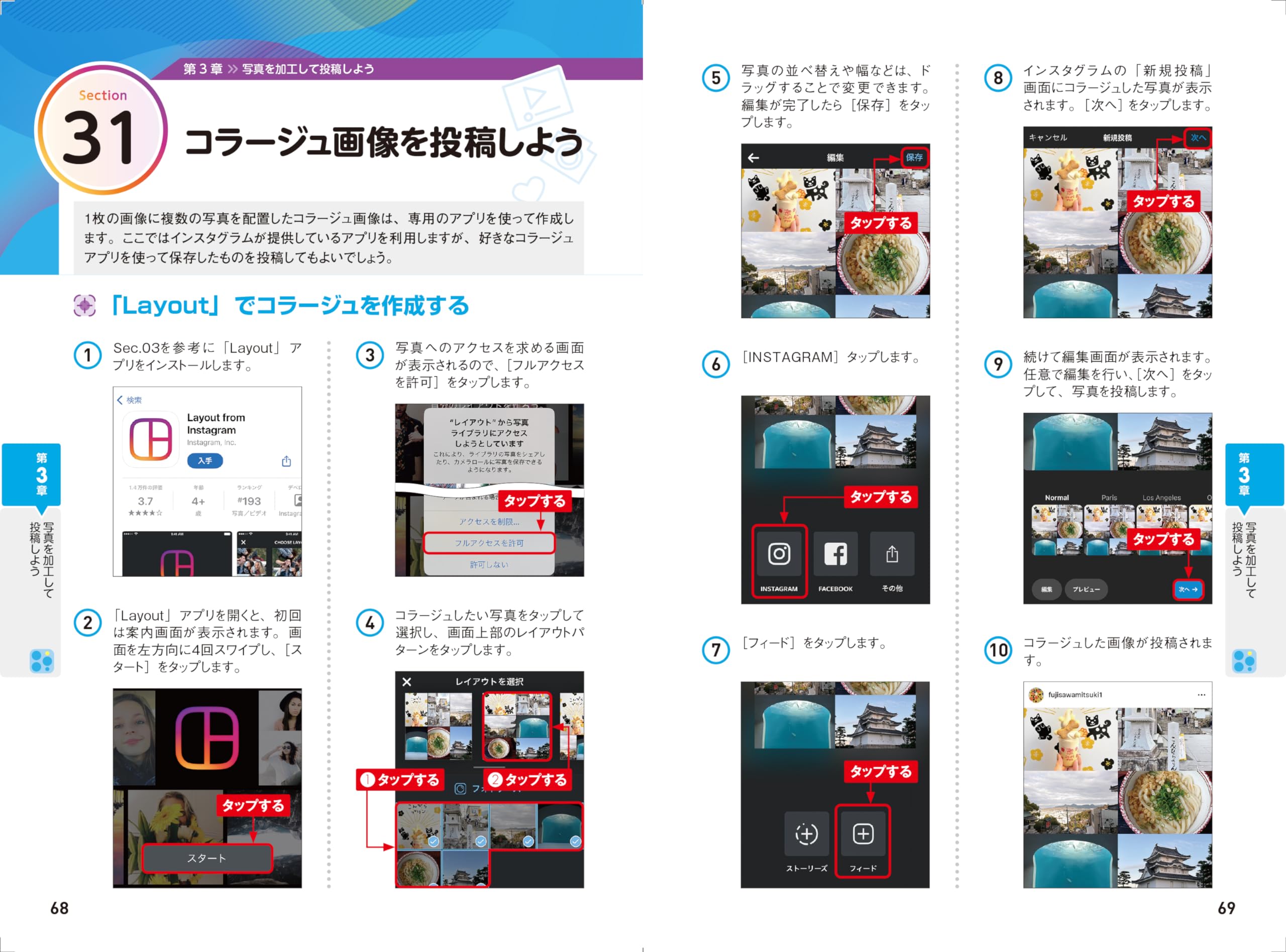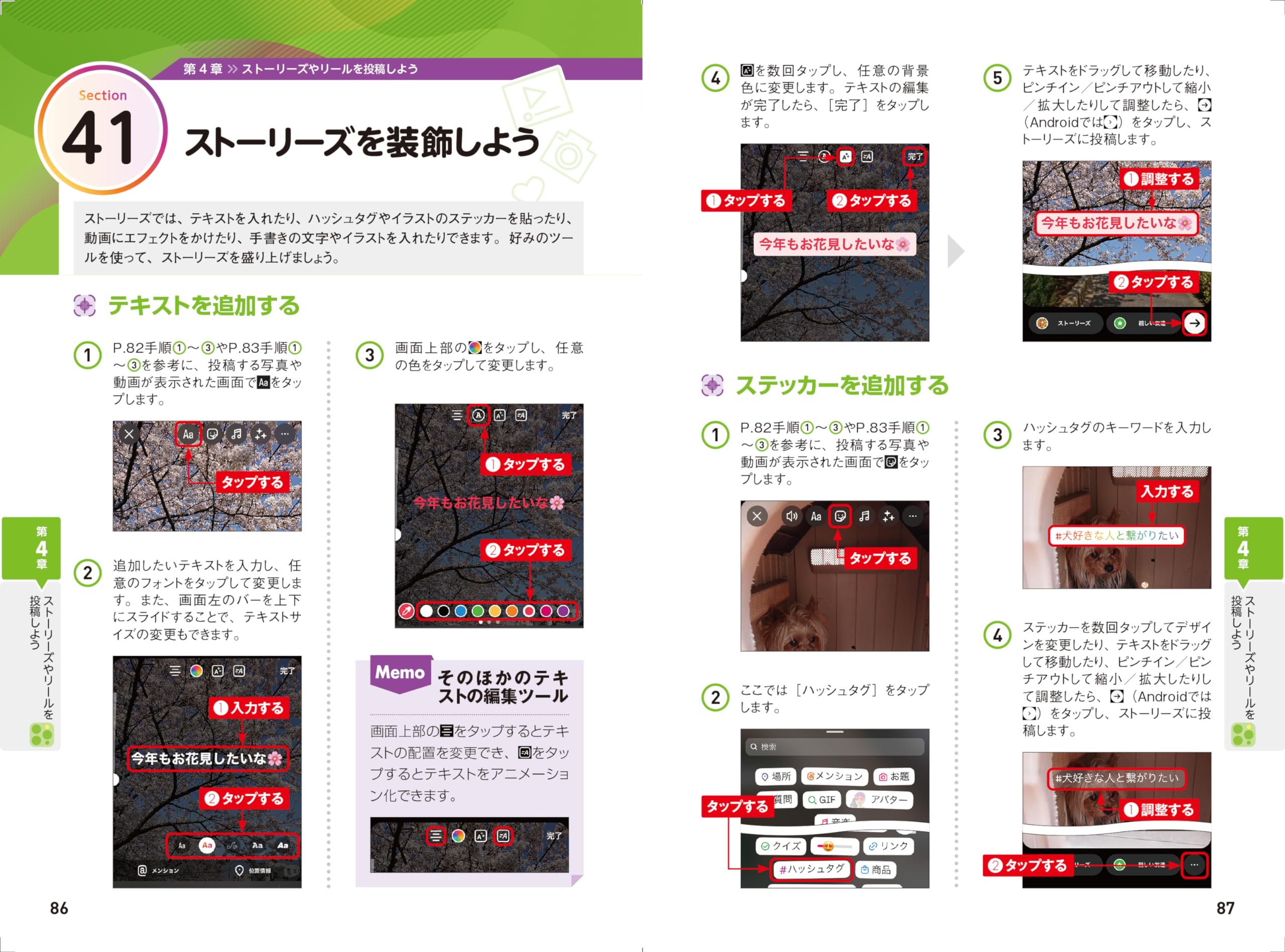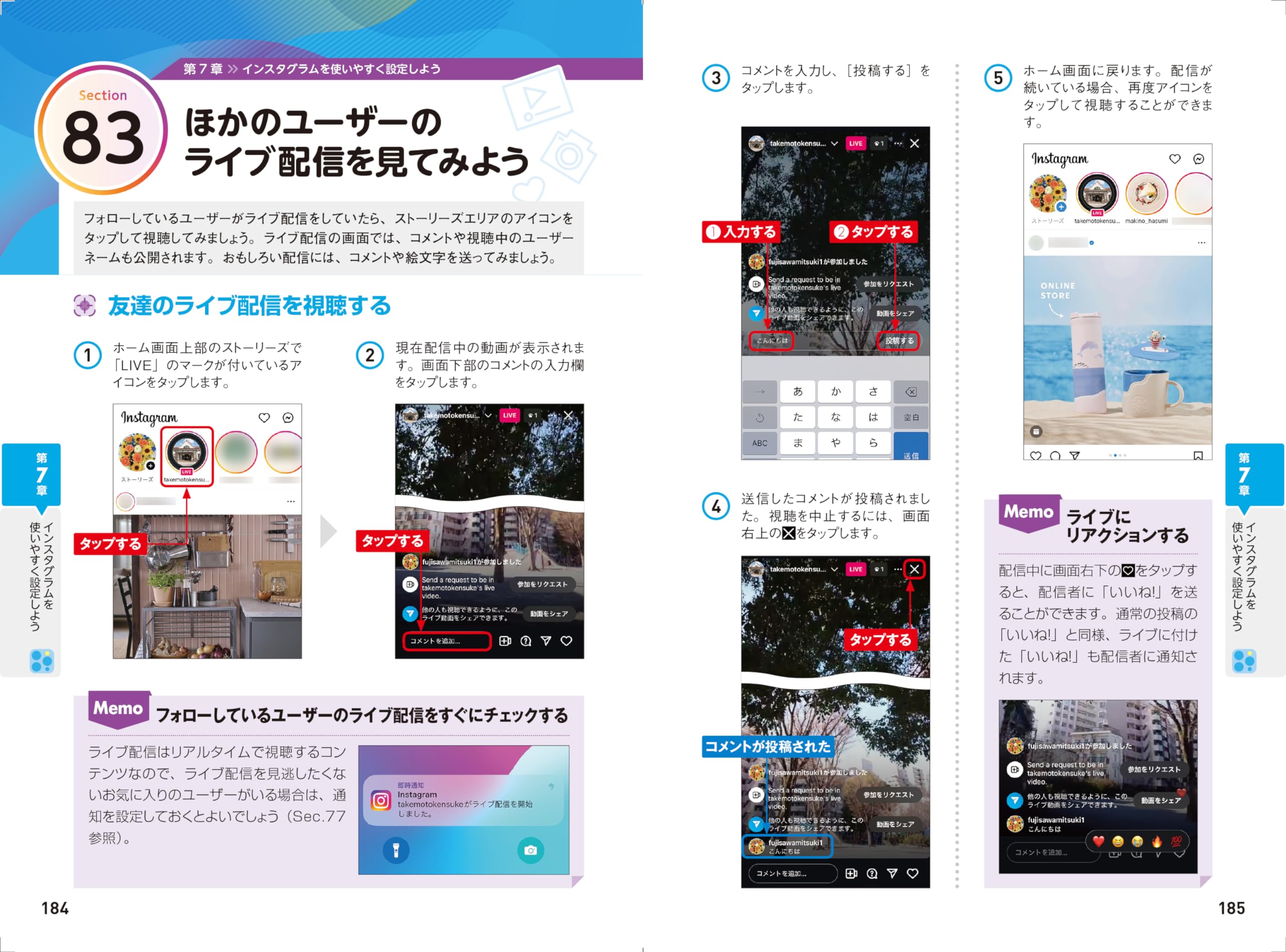 2024年最新の動画機能(リール・ストーリーズ・インスタライブ)を操作手順ごとにスクリーンショット付きで解説。撮影から公開範囲設定・ゲスト招待まで、この1冊でひと通りカバーされている。