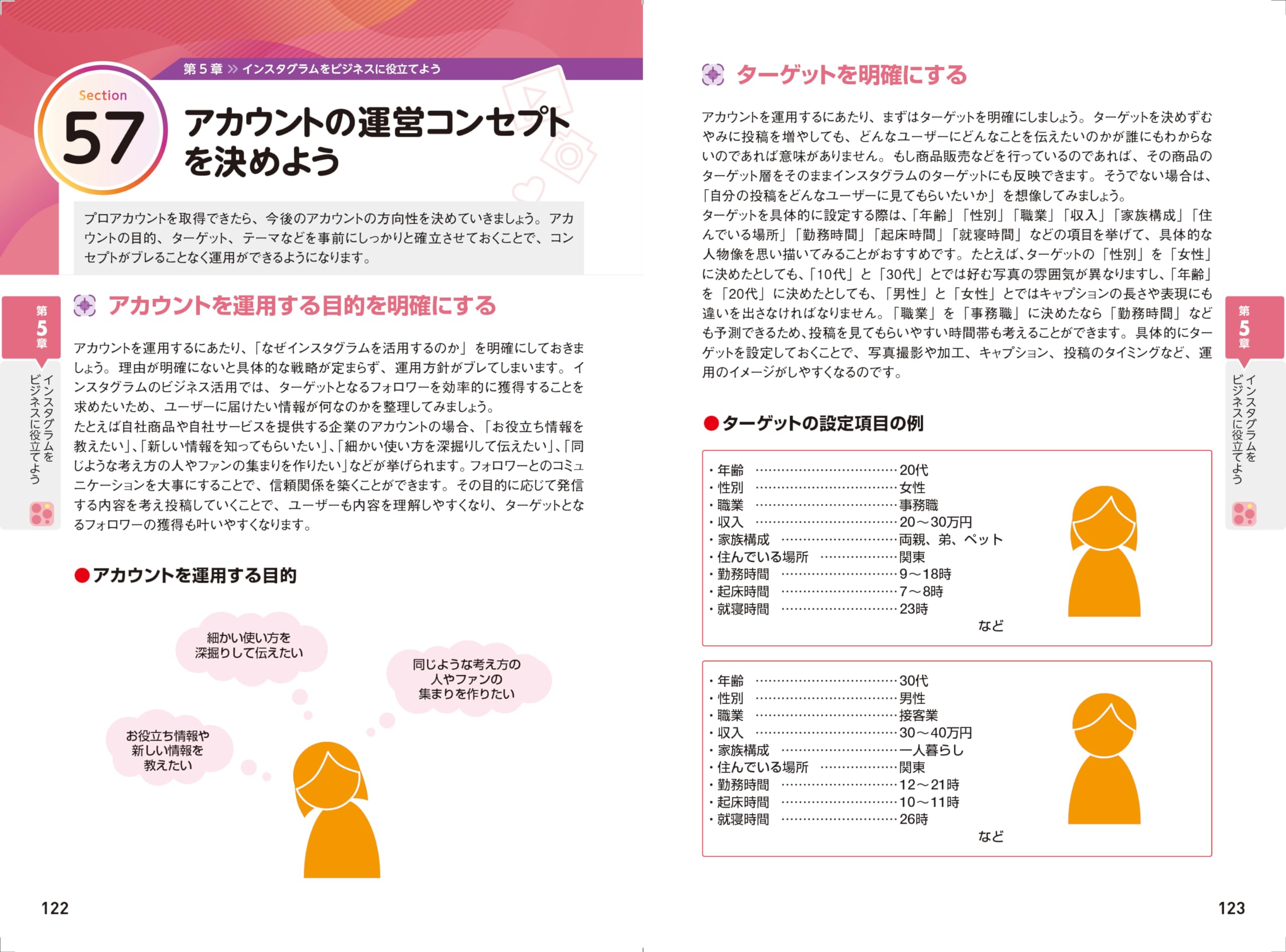 集客・販促をテーマにしたChapter 5では、ビジネスアカウント設定・インサイト分析・ショッピング機能を解説。SNSマーケティングのパイオニアLIDDELL株式会社が監修しているため、アルゴリズムの仕組みまで説明されている。